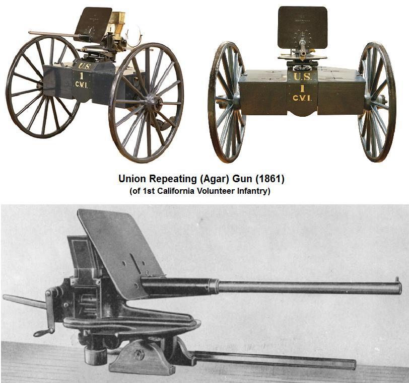 There were two machinegun like weapons available to arm the Armoured Tractor. These were the Agar Gun, of which the Union Army eventually purchased a total of 64 (in 1861/62), and the Gatling Gun, of which 12 were purchased personally by Gen. Benjamin F. Butler, commanding the Army of the James, and employed during the siege of Petersburg, Virginia (June 1864). The Gatling Gun was not adopted by the Army until 1866 but the United States Navy purchased eight Gatling guns to be fitted on gunboats. As early multi-barrel guns were approximately the size and weight of contemporary artillery pieces my preference is toward the lighter Agar Gun, which was at least part of the Union inventory even if it was greatly under appreciated. The Agar Gun fired standard .58 calibre/65 grain paper cartridges loaded into re-usable metal tubes with a separate percussion cap fitted to a nipple at the rear, effectively creating a centerfire cartridge. These were then placed into a funnel shaped hopper, which gave the weapon its “coffee mill” appearance, and fed into the weapon and fired using a hand crank located at the rear of the gun. The special steel tubes used to hold the cartridges were heavy and expensive but were a required component of the system as, locked in place by a wedge shaped block, they comprised the firing chamber of the weapon. The single barrel design proved prone to overheating and the weapon was also prone to jamming so that the rate of fire was mechanically limited to 120 rounds per minute, which helped to control this. During a 1000 round firing test in 1861 (at 100 rds/m) the barrel reportedly became incandescent and the lining melted, which may well be the first recorded instance of a gunner “burning out” a barrel. For that reason the gun was designed to allow barrels to be quickly replaced and spares were always carried. Although a cooling system was devised (involving a fan powered by the crank), overheating in normal use could be prevented entirely by extending the existing shroud over the barrel (as per the 1911 Lewis gun) or adding a water-jacket (as per Confederate 1861 Hughes 1.5-in/38mm gun and 1884 Maxim Gun) to the design. The Agar Gun had an effective range of about 800 yards, which was roughly the same as the range of the rifle-muskets used by infantry, and each gun cost a minimum of $735 ($20,197 in 2016).