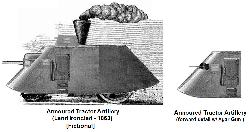 Joseph Fawkes’ steam plough of 1858 would be an excellent basis for the Armoured Artillery Tractor. He demonstrated his engine at the state fair in Centralia, Illinois on September 17, 1858 by ploughing a strip of land baked by summer drought. However, when Fawkes attempted another ploughing exhibition at Decatur, Illinois some two months later, the ground was soft due to heavy rains and the 10-ton machine bogged down. In 1861 Fawkes again exhibited his invention at the ‘United States Fair’ in Chicago in competition with other steam ploughs designed by James Waters of Detroit (which broke down early on) and John Van Doren of Chicago. The engine of Fawkes’ machine derived its traction from a big driving drum rather than from wheels while the competing machine got its traction from two driving wheels some 12 feet in diameter, similar to the British Fowler steam tractor. His drum cylinder machine traveled on the surface of the soil with no difficulty while the big drivers on the other entry sank into the ground. Fawkes’ plough proved superior in this test, in which the engine was run up the various grades of the fair grounds, passing into a gully and moving out without the least difficulty. Steam, by the indicator, was marked at only 62% and upon measurement the grade was found to be one foot vertical to four set on the horizontal line (about 7%). The engine could also be safely run across an inclined plane of thirty degrees, because of its great breadth of base (six feet) and low centre of gravity. Fawkes, seeing a business opportunity, moved to Illinois with the idea of manufacturing steam ploughs but the Civil War intervened.