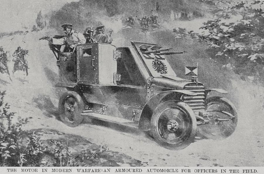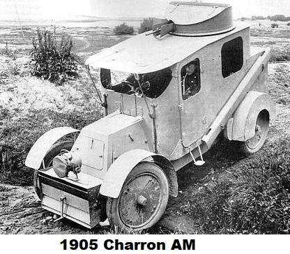 The world’s first fully armoured car was the French Charron, designed by a Russian officer, M.A. Nakasjidze, based on his experiences from the then ongoing Russo-Japanese war, and it was rolled out in 1905. It was basically an ordinary automobile, including large windows with shutters, equipped with a steel plate body and a roof mounted turret. Twelve were built and shipped by rail to Russia in 1908, two of these being seized in transit and tested thoroughly by the German army during maneuvers that year, and four Charron vehicles were used by the French army at the outbreak of WWI,