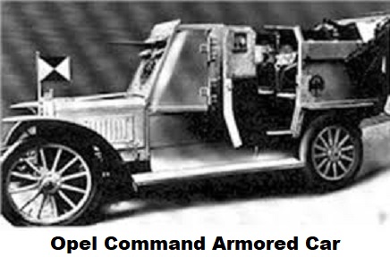 The Opel company introduced one of the first versions of the armored car to the order of the German War Office in 1906 and unveiled its first project in the automotive exhibition in the same year. It was the headquarters polubronirovanny armored car. The outlines of the vehicle were similar to an ordinary heavy motorcar except that the whole of the body was heavily armoured with steel plates and the surface was constructed with as few projections as possible. The interior was fitted with six seats, for crew and 4 passengers or a machine gun crew. One mg could be mounted in the body, and swivelled in any direction, while a second one was placed in the co-drivers position of the covered driving compartment. Two telescopes were placed between the fixed and revolving seats—one on each side of the car—on immovable stands and was outfitted wit two desks and appropriate storage for the accommodation of maps. Though this would have served as an excellent reconnissance or command vehicle, the German command did not show much interest in the car.