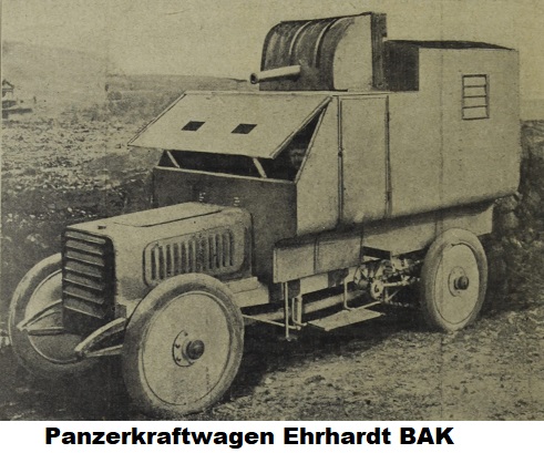 The development of German armoured Cars began in 1906 with the Ehrhardt BAK (Ballon Abwehr Kanone), actually an armoured anti-aircraft platform. But there was little interest despite Ehrhardt having a single armoured car tested in the United States,
